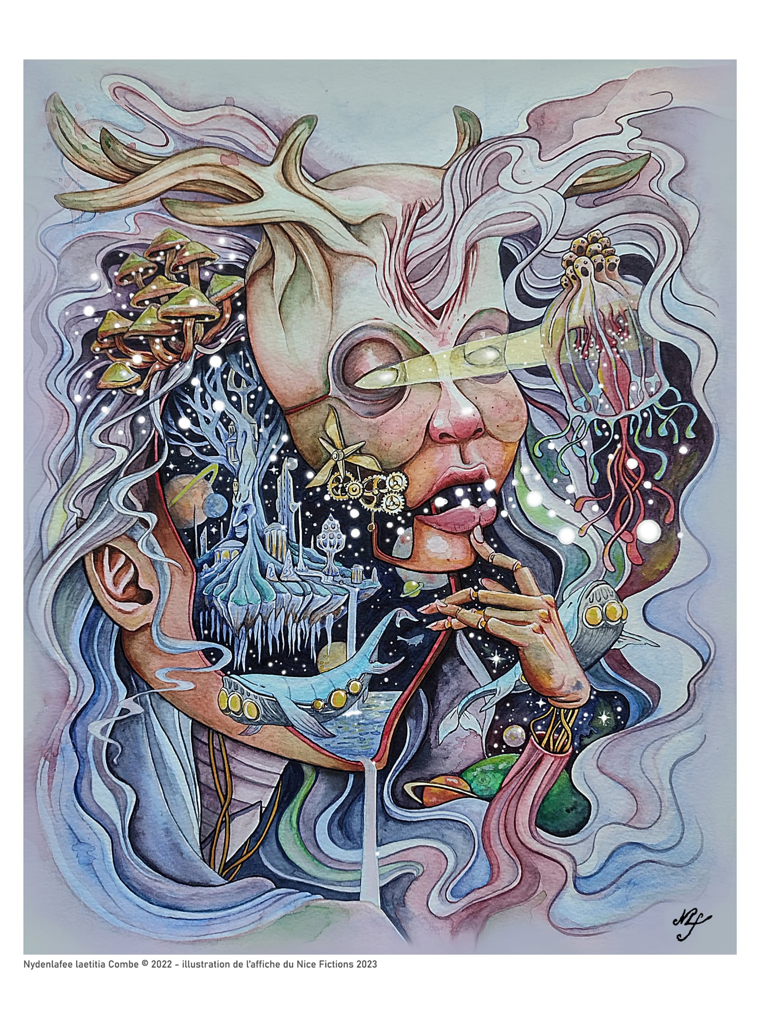 Laetitia Combe, alias Nydenlafee, est une illustratrice freelance de jeux de rôle, dessinatrice de fanzines surréalistes et autrice engagée dans les luttes féministes LGBTQI+. Avec un univers de fantasy très onirique, elle s’oppose catégoriquement à l’utilisation des IAG dans la création et privilégie les techniques de dessin classique au graphite, la peinture traditionnelle à l’aquarelle et le dessin digital au stylet.